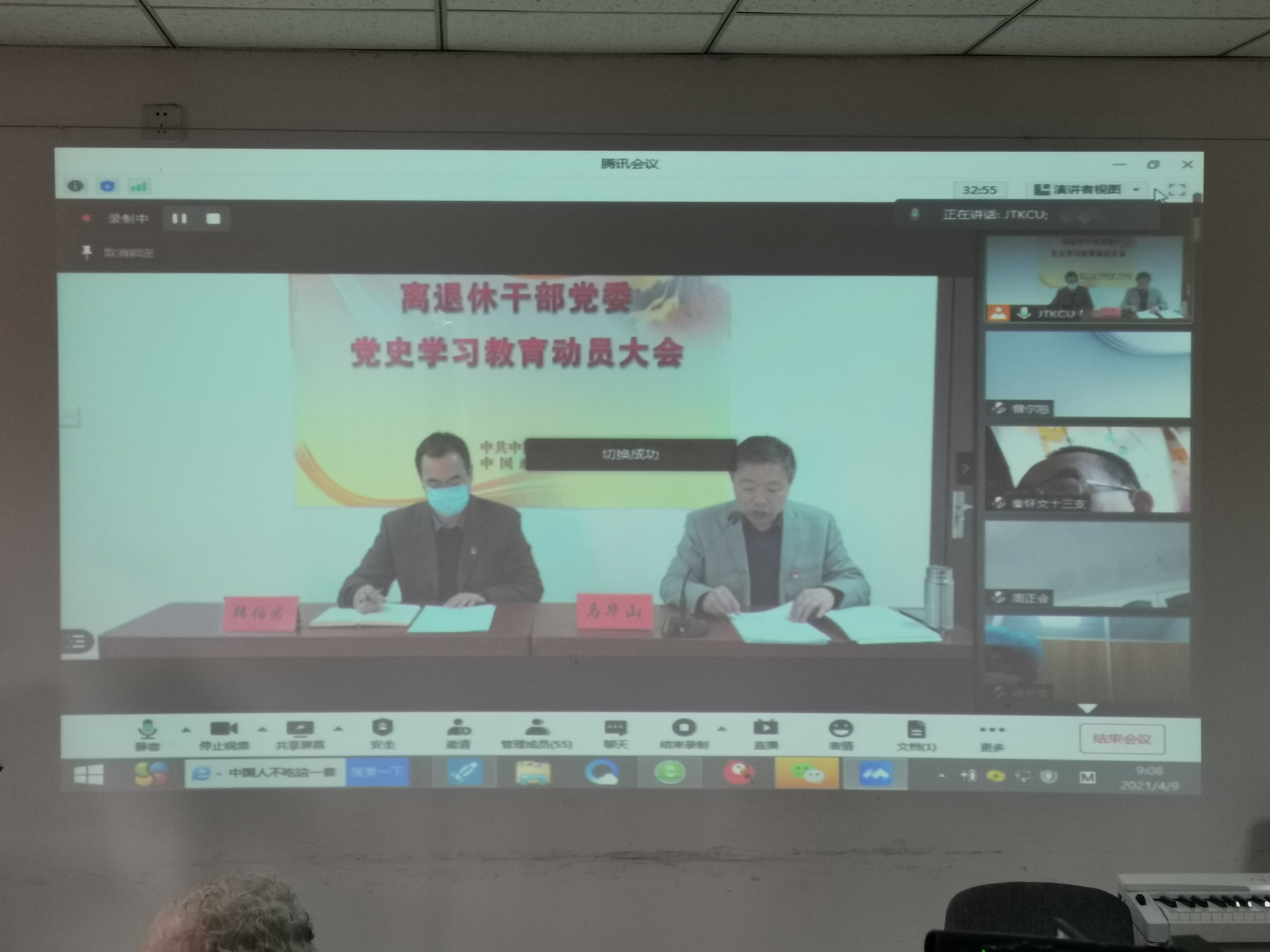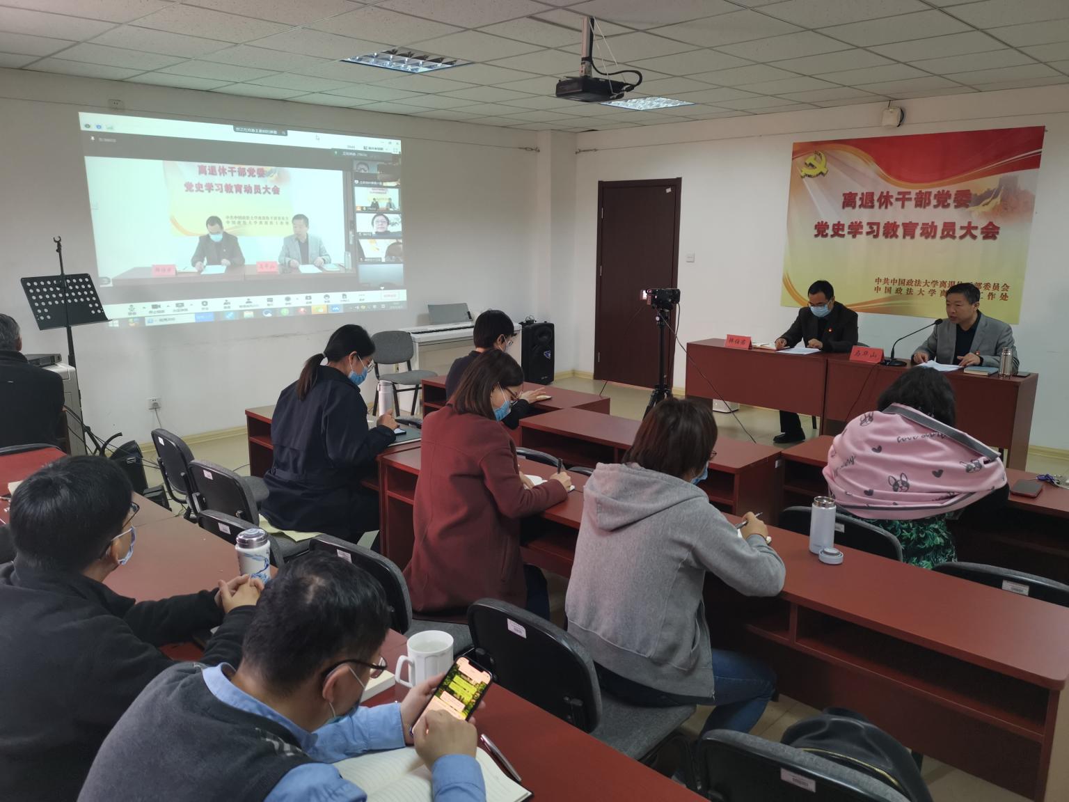 4月9日,离退休干部党委召开党史学习教育动员大会。全体离退休干部党委委员、党支部书记、委员、离退休党员代表、在职党员参加会议。会议以线上、线下相结合的方式召开。