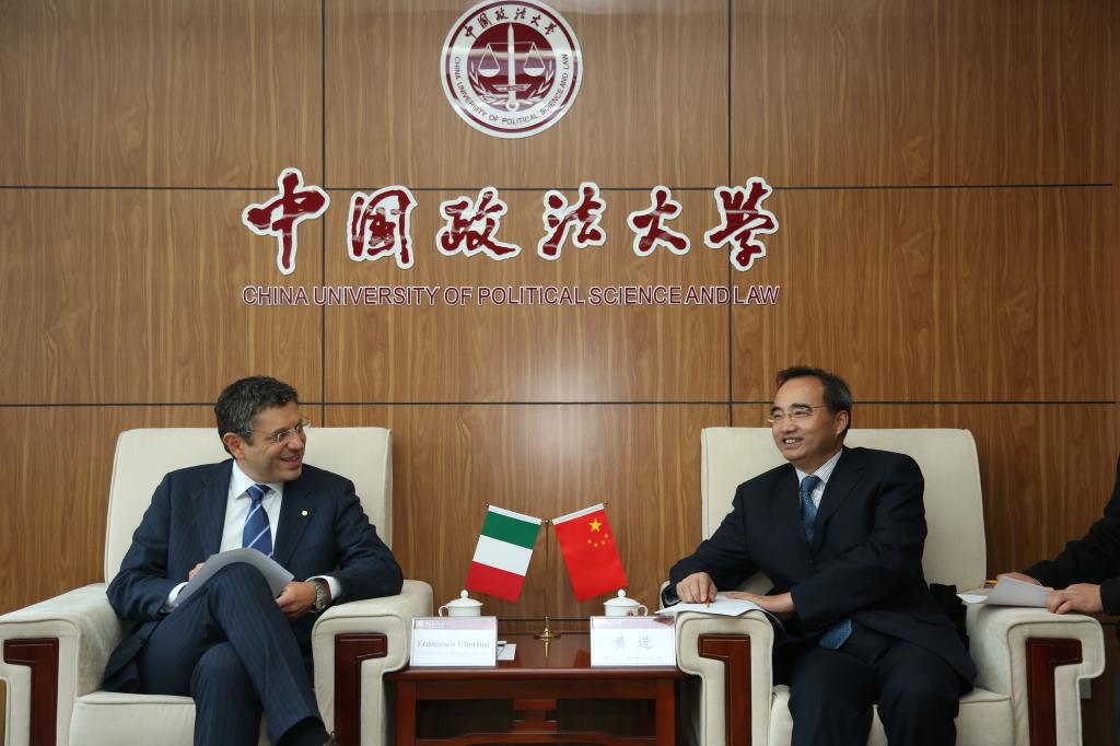 黄进首先欢迎Ubertini一行到访,并高度评价了被誉为“现代大学之母”的博洛尼亚大学。他说,博洛尼亚大学是世界上的第一所大学,它的建设是从法学教育、法学院开始的,而法大也是以法学教育见长的大学。相比较而言,法大虽建校历史短,但经过64年的建设和发展,取得了较大的成就,被誉为“中国法学教育的最高学府”,正逐步发展成为多科性大学。我校是博洛尼亚大学在中国的第一个合作伙伴大学,我们对此深感荣幸。他回忆道,2009年访问博洛尼亚大学,正值其前任校长Ivano Dionigi刚刚上任,很荣幸成为其接待的第一位外国校长,而今天也是Ubertini自2015年上任以来首次来华访问,希望借此机会能够进一步推动双方交流,把合作提升到一个新的高度。黄进还详细介绍了我校在特色人才培养、参与国家法治建设、国际化发展战略等领域的情况。