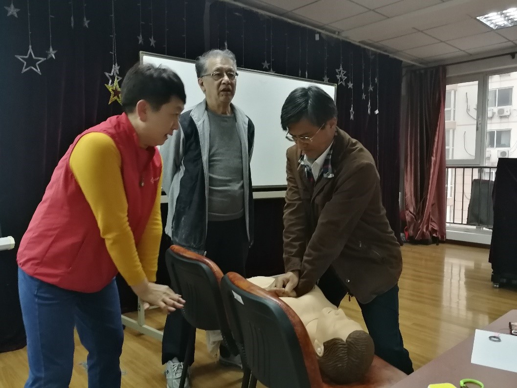 (傅喜带领大家现场进行胸外心脏按压法操作)