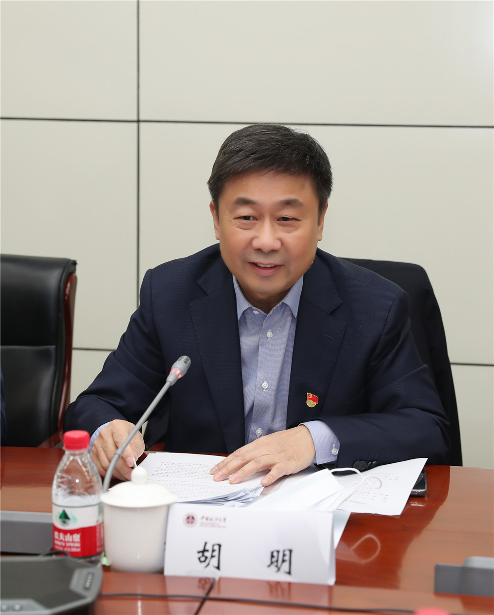 (胡明向指导组介绍学校党史学习教育开展情况 摄影 卢云开)