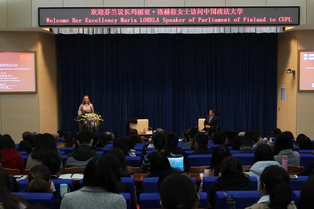 会谈结束后,玛丽亚·洛赫拉在学术报告厅发表了题为《芬兰立法系统和议会》(Introduction to Finland Legal System and Parliament)的精彩演讲。她回顾了芬兰的历史与现状,谈到了自己从政的个人经历及初衷,包括女性的政治参与情况、芬兰的基本政治制度和议会的地位,特别是介绍了中芬两国政治、经济、文化、科技上的交流与合作情况,提出了未来发展的机遇与挑战,强调如何深化、拓宽、加强双边关系。随后,我校师生就性别平等、全球治理、司法合作、移民政策等问题积极提问,现场气氛热烈。讲座由学校副校长马怀德主持,来自法学院、国际法学院、比较法学研究院约200名师生代表参加了讲座。