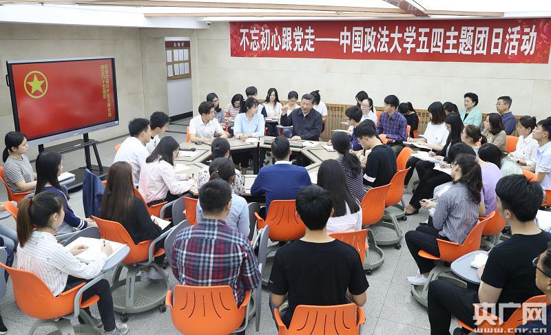 在学生活动中心一层大厅,民商经济法学院本科二年级2班团支部正在开展“不忘初心跟党走”主题团日活动。习近平来到他们中间,同学们报以热烈掌声。几位同学从不同角度畅谈观看电影《焦裕禄》的体会,习近平认真倾听,并参与讨论。习近平语重心长地对同学们说,新中国成立以来,我们党和人民一路筚路蓝缕、艰苦奋斗走来,使国家越来越富强、民族越来越兴盛、人民越来越幸福,其中很重要的一条就是有无数焦裕禄这样的优秀党员、干部为党和人民无私奉献。焦裕禄同志的事迹归结到一点,就是坚定跟党走,他一生都在为党分忧、为党添彩。焦裕禄精神跨越时空,永远不会过时,我们要结合时代特点不断发扬光大。希望大家矢志不渝,用一生来践行跟党走的理想追求。共青团是党的助手和后备军,要始终保持先进性,广大团员青年坚定跟党走,就是初心。不忘这个初心,是我国广大青年的政治选择,也是我国广大青年的人生航向。习近平勉励同学们珍惜韶华,潜心读书,敏于求知,做到德智体美全面发展,毕业后为祖国和人民施展自己的才华,实现自己的人生价值。