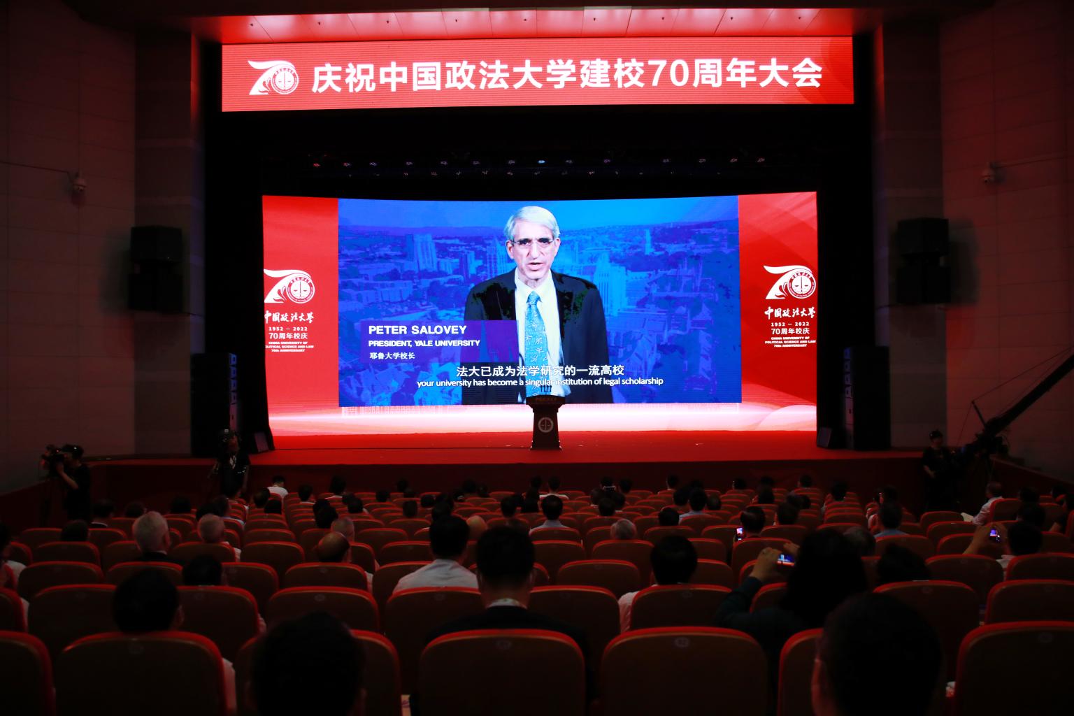 (耶鲁大学校长苏必德通过视频代表国外大学致辞 摄影 尹建峰)